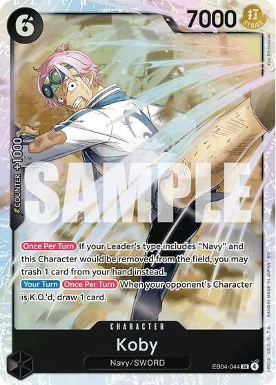 Koby (EB04-044) is a Super Rare card from the Adventure on Kamis Island set of the One Piece Card Game. Super Rares are high-rarity cards featuring detailed artwork.
