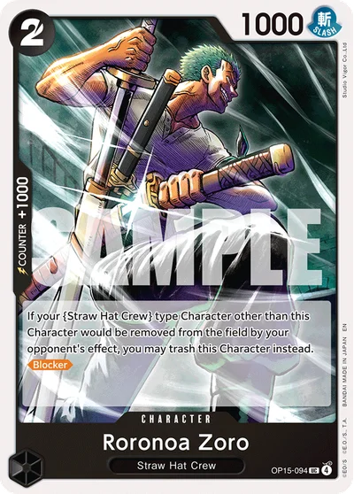 Roronoa Zoro (OP15-094) is a Uncommon card from the Adventure on Kamis Island set of the One Piece Card Game.