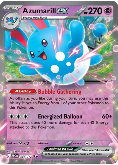 Azumarill ex #084 is a Double rare card from the Ascended Heroes expansion of the Pokémon Trading Card Game. It is part of the Mega Evolution series, making it one of the harder cards to pull from a booster pack.