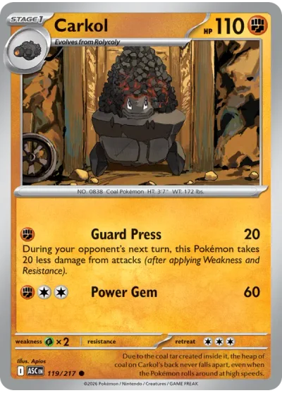 Carkol #119 is a Common card from the Ascended Heroes expansion of the Pokémon Trading Card Game. It is part of the Mega Evolution series.