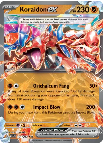 Koraidon ex #121 is a Double rare card from the Ascended Heroes expansion of the Pokémon Trading Card Game. It is part of the Mega Evolution series, making it one of the harder cards to pull from a booster pack.