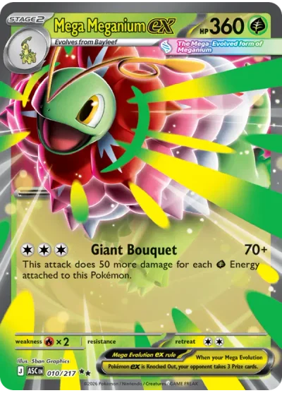 Mega Meganium ex #010 is a Double rare card from the Ascended Heroes expansion of the Pokémon Trading Card Game. It is part of the Mega Evolution series, making it one of the harder cards to pull from a booster pack.