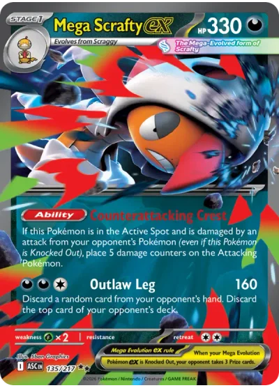 Mega Scrafty ex #135 is a Double rare card from the Ascended Heroes expansion of the Pokémon Trading Card Game. It is part of the Mega Evolution series, making it one of the harder cards to pull from a booster pack.