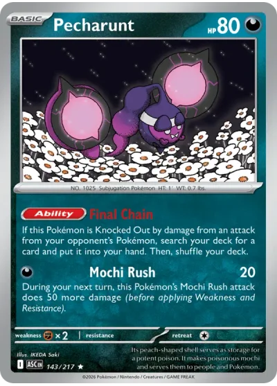 Pecharunt #143 is a Rare card from the Ascended Heroes expansion of the Pokémon Trading Card Game. It is part of the Mega Evolution series, making it one of the harder cards to pull from a booster pack.