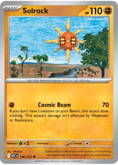 Solrock #106 is a Uncommon card from the Ascended Heroes expansion of the Pokémon Trading Card Game. It is part of the Mega Evolution series.