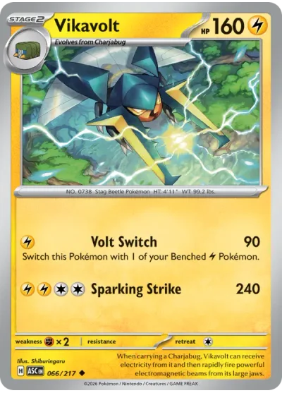 Vikavolt #066 is a Uncommon card from the Ascended Heroes expansion of the Pokémon Trading Card Game. It is part of the Mega Evolution series.