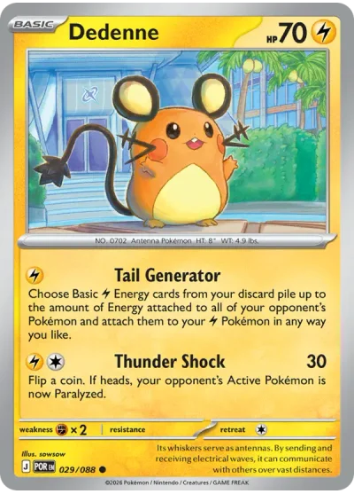 Dedenne #029 is a Common card from the Perfect Order (ME3) expansion of the Pokémon Trading Card Game. It is part of the Mega Evolution series.
