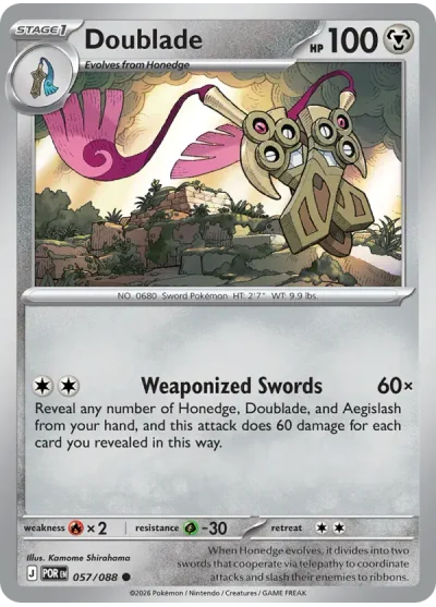 Doublade #057 is a Common card from the Perfect Order (ME3) expansion of the Pokémon Trading Card Game. It is part of the Mega Evolution series.