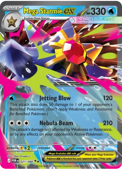Mega Starmie ex #021 is a Double rare card from the Perfect Order (ME3) expansion of the Pokémon Trading Card Game. It is part of the Mega Evolution series, making it one of the harder cards to pull from a booster pack.