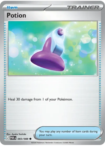 Potion #083 is a Common card from the Perfect Order (ME3) expansion of the Pokémon Trading Card Game. It is part of the Mega Evolution series.