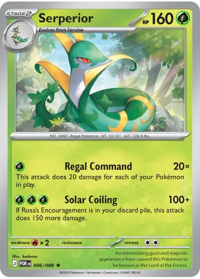 Serperior #006 is a Rare card from the Perfect Order (ME3) expansion of the Pokémon Trading Card Game. It is part of the Mega Evolution series, making it one of the harder cards to pull from a booster pack.
