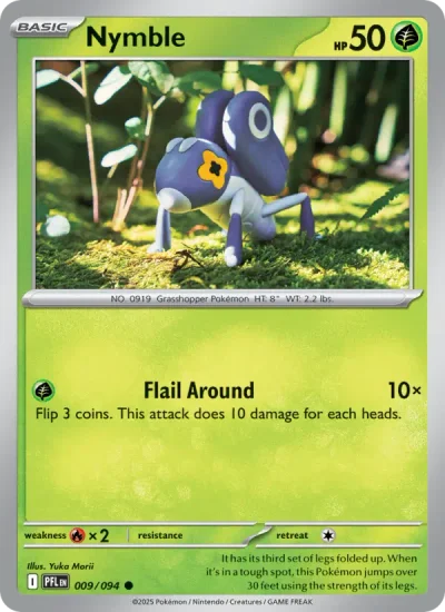Nymble #009 is a Common card from the Phantasmal Flames expansion of the Pokémon Trading Card Game. It is part of the Mega Evolution series.
