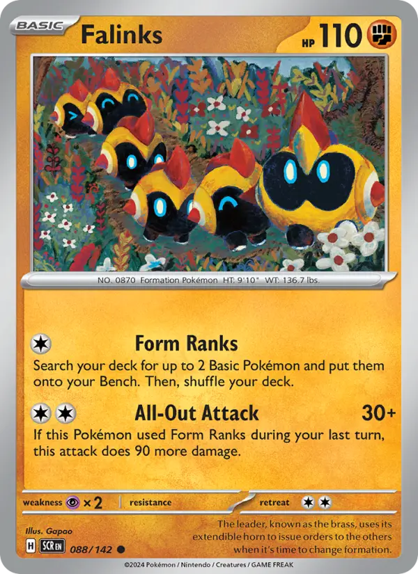 Falinks #088 is a Common card from the Stellar Crown (SV7) expansion of the Pokémon Trading Card Game. It is part of the Scarlet & Violet series.